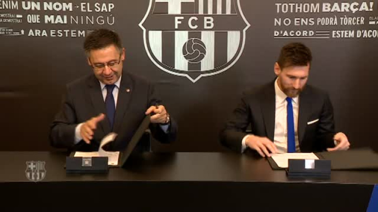 El jugador de fútbol Leo Messi ha firmado este sábado la ampliación de su contrato con el FC Barcelona hasta el 30 de junio de 2021. Una renovación muy esperada por la familia culé. El Barça se asegura con este contrato los servicios de uno de los mejores jugadores del mundo, que finalizaría su vínculo con el club después de 17 temporadas en el primer equipo. Messi ha firmado el contrato esta mañana, en un acto que ha tenido lugar en las oficinas del club y que ha compartido con el presidente de la entidad Josep Maria Bartomeu. La cláusula de rescisión asciende a los 700 millones de euros.