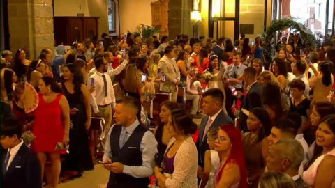 Nunca en España se había celebrado una macroboda. No hay 2 anillos, sino 36, ya que se han casado 18 parejas al mismo tiempo. Nerviosos novios, padrinos y también el párroco, en una boda larga. Fue él quien buscó la solución al descenso de las bodas religiosas. Sí al sacramento del matrimonio, lo importante en las bodas religiosas. De todo lo demás se han encargado 50 voluntarios de la iglesia. Los vestidos, prestados. Hasta se ha conseguido la bendición papal. Campanas de boda para que ninguna pareja renuncie a casarse si falta el dinero. Brindis a la salida, celebración por las fiestas de la localidad y si de una boda sale otra boda, de ésta han salido 18.