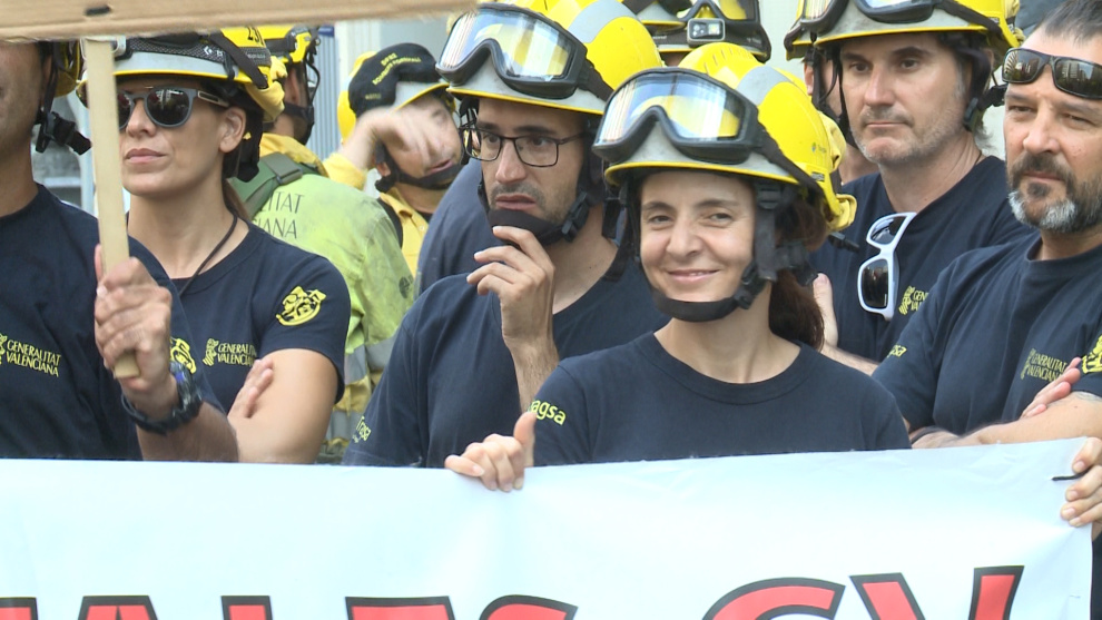 Imágenes de la manifestación iniciada con una concentración de una hora ante la sede de Tragsa en la calle Cronista Carreres de los bomberos forestales.