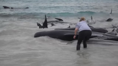 Video AP-LaPresse/Agencia Atlas.- Casi un centenar de ballenas piloto quedaron varadas en aguas poco profundas a unos 150 metros de una playa al suroeste de Australia. 51 de ellas murieron. Profesionales y voluntarios intentan ahora llevar a las otras 46 mar adentro para salvarles la vida. Estos cetáceos de aleta larga son muy sociables y este tipo de varamientos son frecuentes en Australia y Nueva Zelanda. Según los expertos en vida silvestre podrían deberse al estrés, a alguna enfermedad, errores de navegación o cambios repentinos en las mareas.