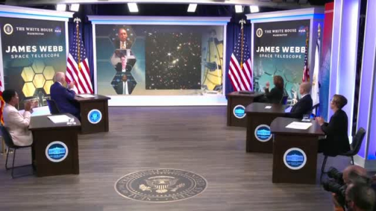 En la Casa Blanca, en un acto presidido por el presidente Joe Biden se ha dado a conocer la primera imagen tomada por el telescopio espacial James Webb. Es la imagen más profunda del universo jamás tomada. Alcanza una distancia de 13.000 millones de años luz y muestra un cúmulo de galaxias, cuya potente luz distorsiona la de los objetos que se sitúan detrás.