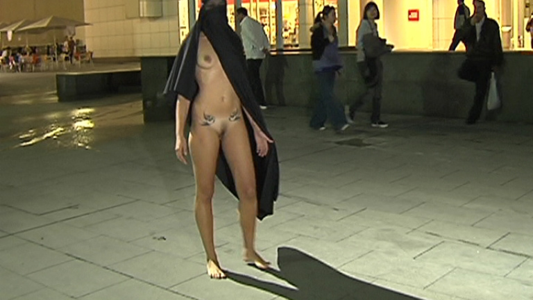 Declaraciones del artista multimedia Luizo Vega e imágenes de la performance donde una mujer se pasea por el centro de la capital catalana, desnuda y con la cara tapada por un burka, para mostrar su repulsa por la posible ejecución de la mujer iraní.
