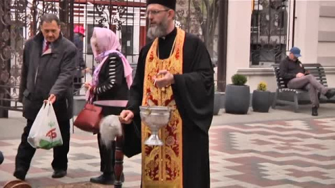 Vladimir, sacerdote. Bendice rociando con agua bendita una y otra vez a la gente. También a los alimentos, piden por la paz. Así se ha celebrado la Pascua Ortodoxa en Ucrania. En medio de la guerra. "Los rusos han olvidado como ser un ser humano" señala Vladimir. Desde que comenzó la guerra, la iglesia ortodoxa ucraniana quiere alejarse del patriarca de Moscú. "Es imposible que cambie", nos dice Vladimir. En el Dombás, Dionisio, capellán en el frente y en la ciudad. Nos invita al templo. Sobre la ropa militar se coloca las prendas eclesiásticas. "Me conectaré a internet y transmitiré la misa online" nos dice. Reza y canta para bendecir los alimentos. Es una festividad alegre como los ritos ortodoxos. Siempre sonrientes e incluso con un toque de superstición. Una vez que el huevo se ha bendecido hay que chocarlo contra otro, quien lo rompa primero se llevará consigo la buena suerte.