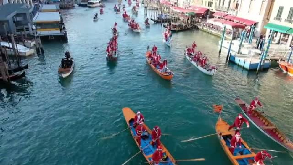 Decenas de Papás Noel han recorrido en góndolas hoy el Gran Canal de Venecia. Se trata de una tradicional regata navideña que este año celebra su 12 edición.