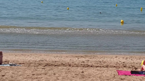 Personas tomando el sol y dándose los primeros baños de la temporada en la playa del Miracle de Tarragona que ya se encuentra en fase 2 del desconfinamiento.