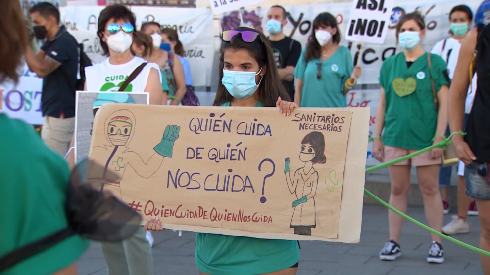 El movimiento 'Sanitarios Necesarios' ha reclamado este lunes en la madrileña Puerta del Sol más recursos para la sanidad pública, una mejora de las condiciones laborales de los profesionales de la salud y el fin de las privatizaciones en el sistema público de salud.