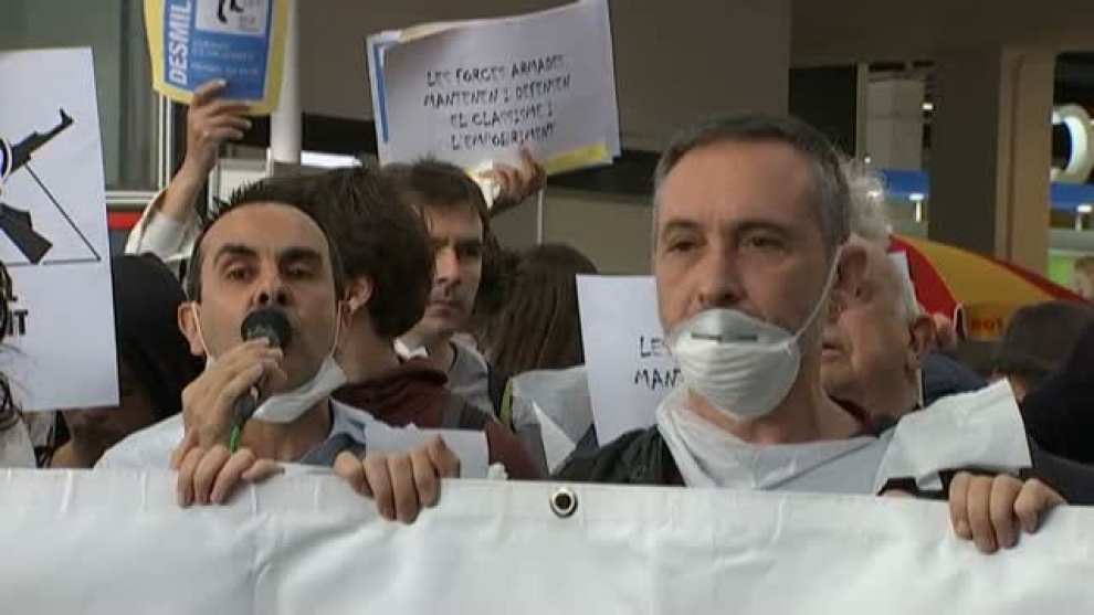 Un grupo de manifestantes de la campaña Desmilitaritzem Catalunya ha asaltado esta mañana el stand de las Fuerzas Armadas en el Salón de la Educación de Barcelona. Ataviados con mascarillas y batas, han precintado el stand y lo han simulado que lo rociaban con spray insecticida "para matar el virus". Los manifestantes portaban además una pancarta con el lema 'Las armas no educan, las armas matan". Algunos de los estudiantes se han encarado a los manifestantes alegando que estaban en su derecho de hacer la carrera militar y de informarse en el marco de una feria como la de la enseñanza. Este año, el Ejército cuenta con un stand de 100 metros cuadrados, más del doble que el año pasado.
