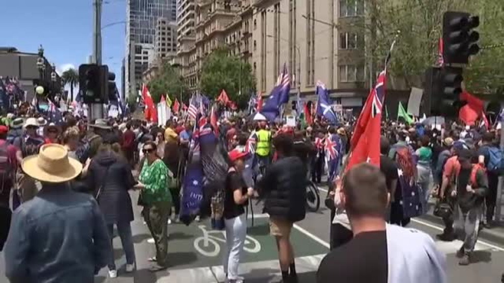 Varios miles de personas han salido a las calles de Melbourne, en Australia, para protestar contra las vacunas y la exigencia del pasaporte verde para acceder a establecimientos públicos y otras industrias, además de para trabajar en centros de sanitarios. A las protestas semanales de los antivacunas ahora se han unido ciudadanos de toda condición. Mientras, otro grupo más pequeño mostraba también en las calles su apoyo a las vacunas y su rechazo a los movimientos de extrema derecha. El 88 por ciento de los australianos mayores de 16 años ya han recibido la pauta completa del suero. Como en otras partes del mundo, la mayoría de los hospitalizados con COVID son personas que no han sido vacunadas. En el estado de Victoria, el 90 por ciento de las 44 personas que se encuentran en la UCI o no se habían inmunizado o no habían recibido las dos dosis.