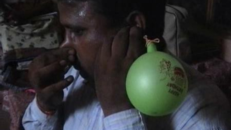 Khem Karan Koli, un ciudadano indio de Moradabad, en el estado septentrional de Uttar Pradesh, es capaz de inflar globos con su oreja. Khem Karan tapa su nariz, cierra su boca y envía todo el aire al canal auditivo. El resultado es la felicidad de los niños de su pueblo que aguardan pacientemente a que el habilidoso hombre hinche un globo tras otro.