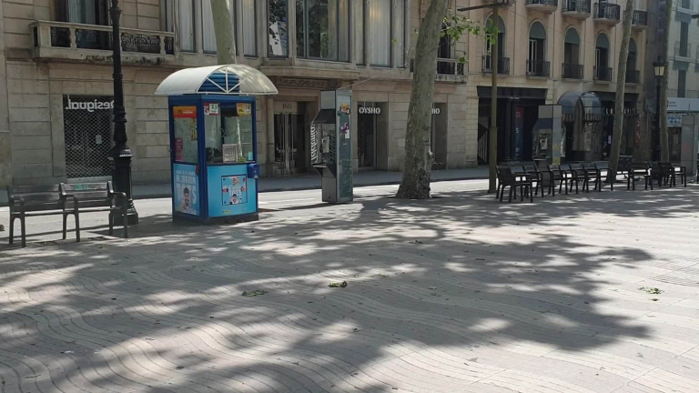 Las Ramblas de Barcelona están vacías por el estado de alarma, una imagen que contrasta con la de años anteriores en los que miles de personas se acercaban para celebrar Sant Jordi.