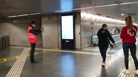 Voluntarios de la Creu Roja han repartido mascarillas a los usuarios del metro de Barcelona este martes, primer día laborable en Cataluña tras la Semana Santa.