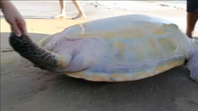 Un grupo de turistas encontró varada este viernes a una tortuga marina en una playa de Sanya, en la provincia de Hainan, en el sur de China. Los bañistas llamaron a la Policía inmediatamente. Los agentes encontraron al animal tumbado sobre su caparazón en la arena. El gran ejemplar, de unos 95 centímetros de largo y 76 centímetros de ancho, estaba demasiado débil para moverse. Incluso en el mes de enero, las temperaturas en Sanya son bastante altas. Protegiendo a la tortuga con una sombrilla y manteniéndola húmeda con cubos de agua, un equipo de expertos trasladó después al animal para evitar que muriese deshidratado.