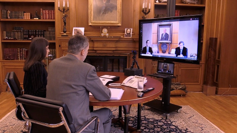 Imágenes de los Reyes de España durante una reunión telemática con el presidente de la Federación Española de Industrias de Alimentación y Bebidas (FIAB), Tomás Pascual Gómez-Cuétara.