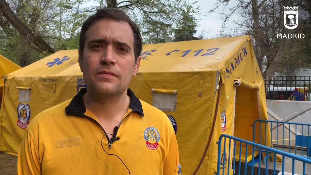 El técnico de Emergencias de SAMUR-Protección Civil, Ignacio Arana, ha explicado cómo funciona la línea de descontaminación de este servicio, por donde pasan "todos los intervinientes que han estado en un posible caso de COVID-19".