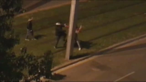 Le golpean y una vez en el suelo, una dos, tres y hasta cuatro patadas en la cabeza. Y la pelea va a más. Puñetazos, patadas y ahora añaden palos. Aquí vemos como miembros de uno de los grupos apalean a estos dos jóvenes hasta dejarlos en el suelo sin apenas poder moverse. Pero aun así las agresiones continúan.