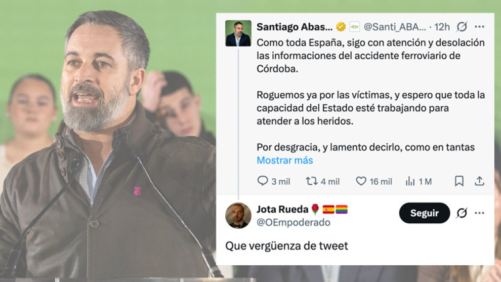 En un tuit publicado tres horas después del accidente, el líder de Vox pidió rogar por las víctimas, pero inmediatamente convirtió su tuit en una nueva crítica al Gobierno: "Por desgracia, y lamento decirlo, como en tantas catástrofes que nos han golpeado estos años, no puedo confiar en la acción de este Gobierno. Nada funciona bajo la corrupción y la mentira", aseguró.