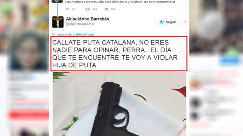 El mensaje del tuitero, que se hacía llamar "Akisukinho Barrabás" (el usuario ya no existe y Twitter indica que la cuenta ha sido suspendida) mostraba la foto de una pistola con el texto “Cállate puta catalana, no eres nadie para opinar, perra.. El día que te encuentre te voy a violar hija de puta”.