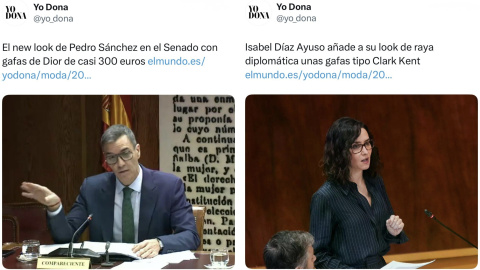Isabel Díaz Ayuso ha aparecido con unas nuevas gafas y muchos medios se han hecho eco del renovado estilo de la presidenta de la Comunidad de Madrid. "Ayuso añade a su look de raya diplomática unas gafas tipo Clark Kent", ha publicado El Mundo. Sin embargo, la comunidad de X ha recordado como trataron al presidente del Gobierno en una situación similar: "Cuando es Sánchez quien se pone gafas, nos cuentan su marca y su precio, para que la gente pueda juzgar".