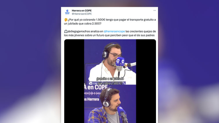 El colaborador de la radio de la Conferencia Episcopal Diego Garrocho aseguró: "Un alumno mío me decía: ¿Por qué yo cobrando 1.500 euros tengo que pagarle el transporte gratuito a un jubilado que cobra 2.500?". Según Garrocho "esto es cierto [...] estamos tomando medidas sociales que miran a la edad y no miran a la renta". Al final de su argumento, ya caretas fuera, cuestionó directamente la revalorización de las pensiones con el IPC si los salarios no suben proporcionalmente. El vídeo ha sido compartido en X por la COPE.