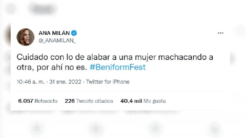 La actriz Ana Milán ha publicado uno de los mensajes que más ha triunfado en Twitter sobre toda la polémica que rodea el Benidorm Fest. Chanel ganó por el voto del jurado profesional y ha sido elegida para ir a Eurovisión, pero las preferencias del público fueron Rigoberta Bandini y Tanxugueiras.