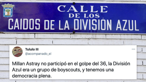 La Justicia mantiene las calles en homenaje a la División Azul y al General franquista Millán Astray. El Tribunal Superior de Justicia de Madrid (TSJM) ha acordado mantener la denominación de la calle Caídos de la División Azul, situada en el distrito de Chamartín. Así consta en una sentencia, a la que tuvo acceso Europa Press, en la que se desestima el recurso de apelación interpuesto por el Ayuntamiento de Madrid contra la sentencia, del Juzgado de lo Contencioso-Administrativo número 8. También ha acordado también mantener la dedicada a Millán Astray, situada en Latina.