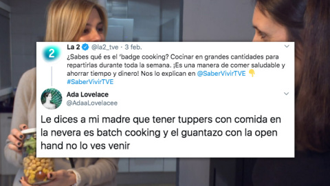 “¿Sabes qué es el ‘badge cooking'?”. Es la pregunta que lanza un tuit de La 2 de Televisión Española, enlazando a un episodio de Saber Vivir. En el capítulo hablan del llamado ‘batch cooking’. ¿Qué esconderá ese termino en inglés que suena tan moderno? Pues… literalmente significa “cocinar por bloques” y consiste en cocinar “en grandes cantidades para repartirlas durante toda la semana”.