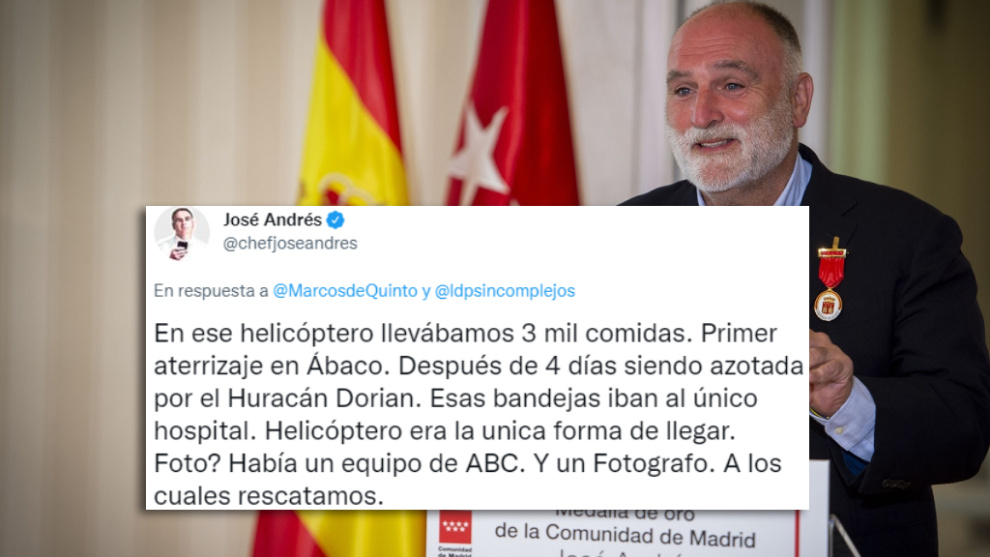 Para colmo, siendo uno de ellos periodista, no se molestaron en comprobar que la fotografía es de 2019, cuando José Andrés llevaba comida en pleno huracán Dorian y no de los incendios que asolan España en los últimos días.
