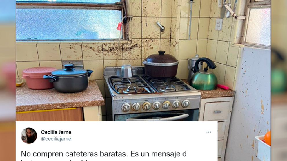 Imagínate que te levantas un día, vas a la cocina para prepararte una buena taza de café para poder despejarte y, de pronto, tu cafetera salta por los aires. Pues esto es lo que, precisamente, le ha ocurrido a la tuitera Cecilia Jarne, quien ha bromeado al decir: "No compren cafeteras baratas. Es un mensaje de luchemos por la vida...".