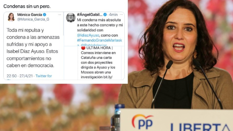 Los sistemas de seguridad de Correos han interceptado una carta con balas que iba dirigida a la presidenta de la Comunidad de Madrid, Isabel Díaz Ayuso. Los líderes políticos de todas las formaciones, también desde el PSOE, Unidas Podemos y Más Madrid, han trasladado su condena ante estas intimidaciones. Lo más destacado de los mensajes de apoyo hacia la candidata del Partido Popular ha sido que no añadían ni un solo 'pero'.