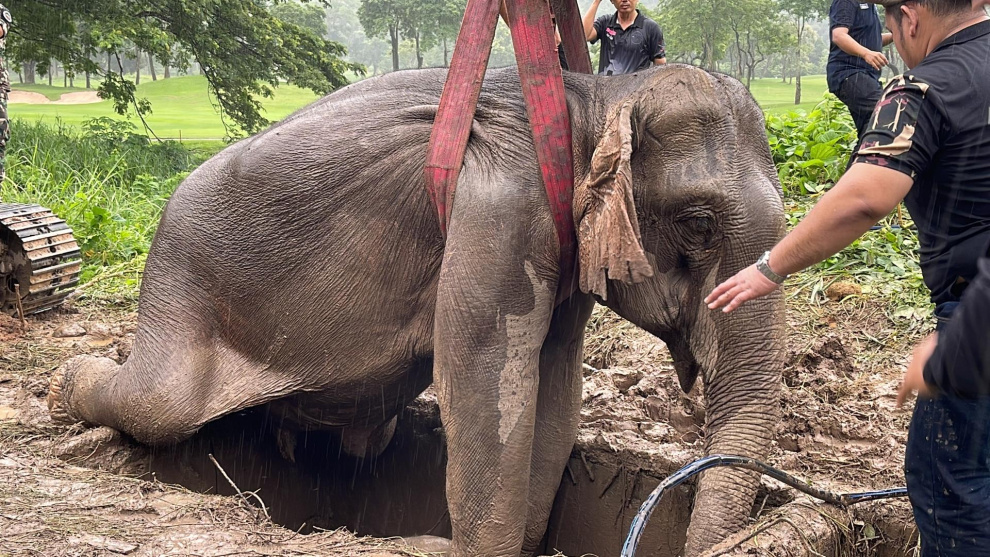 Sucedió en Tailandia cuando, el pasado miércoles, una cría de elefante cayó en un desagüe de un campo de golf. La madre del animal se precipitó en el mismo hoyo tras recibir un sedante, impidiendo el rescate de ambos paquidermos. Cuando una veterinaria, varios voluntarios y personal de un parque nacional finalmente pudieron liberarlos, tuvieron que reanimar a la madre. Estos hicieron maniobras de reanimación cardiopulmonar saltando sobre el elefante.