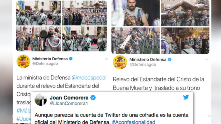 “Aunque parezca la cuenta de Twitter de una cofradía es la cuenta oficial del Ministerio de Defensa”. Con este mensaje, el senador de En Comu Podem por Barcelona, Joan Comorera, ha vuelto a poner el punto de mira en la supuesta aconfesionalidad del Estado y la contradicción con la que se vive en España especialmente durante estos días.