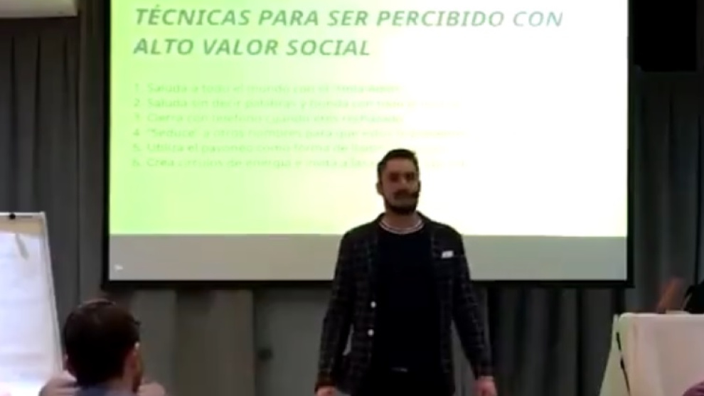 No sabemos quién es ni de dónde ha salido, pero el ponente de un curso para ligar (o eso creemos que es) se ha hecho viral merced a sus estrafalarios consejos para conquistar a las mujeres. Sabemos que las técnicas del coaching, tan de moda en los últimos años, pueden resultar a veces curiosas, sorprendentes, llamativas, diferentes... pero lo de este coach, o lo que sea, es directamente estrámbotico y está trufado de topicazos. Hay varios vídeos de ese taller circulando por Twitter, pero hemos escogido este para abrir boca y situarles en contexto.