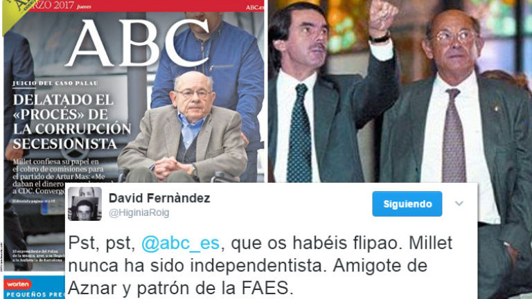 El exdiputado de la CUP David Fernández ha respondido en Twitter al diario ABC por su portada sobre el caso Palau: "Os habéis flipado. Millet nunca ha sido independentista. Amigote de Aznar y patrón de las FAES".