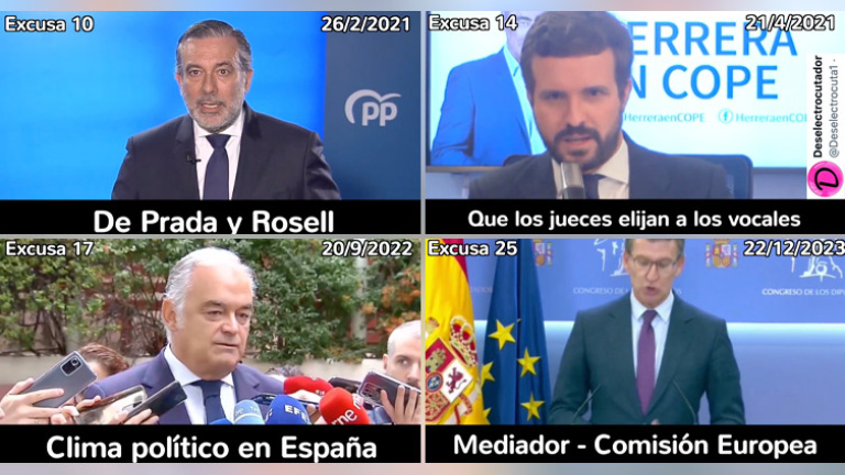 Uno de los últimos capítulos en esta broma de mal gusto fue la mediación exigida por Feijóo. Pero la cosa viene de lejos. Ahora un tuitero ha resumido nada menos que 25 pretextos que han esgrimido en el PP durante los últimos años para mantener el bloqueo del Consejo General del Poder Judicial. Demencial.