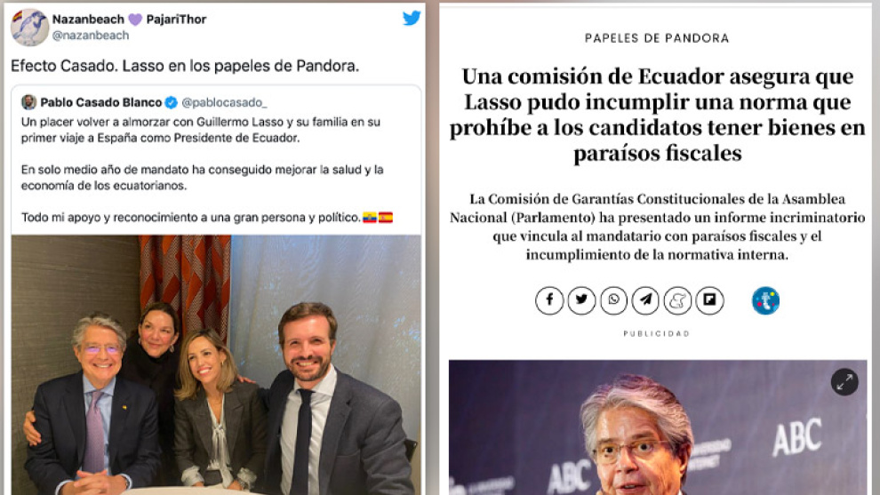 Efectivamente, el viernes Casado publicaba una foto con el presidente de Ecuador, Guillermo Lasso, y decía: "Todo mi apoyo y reconocimiento a una gran persona y político". Otra vez, 24 horas después saltaba la noticia: "Una comisión de Ecuador asegura que Lasso pudo incumplir una norma que prohíbe a los candidatos tener bienes en paraísos fiscales".