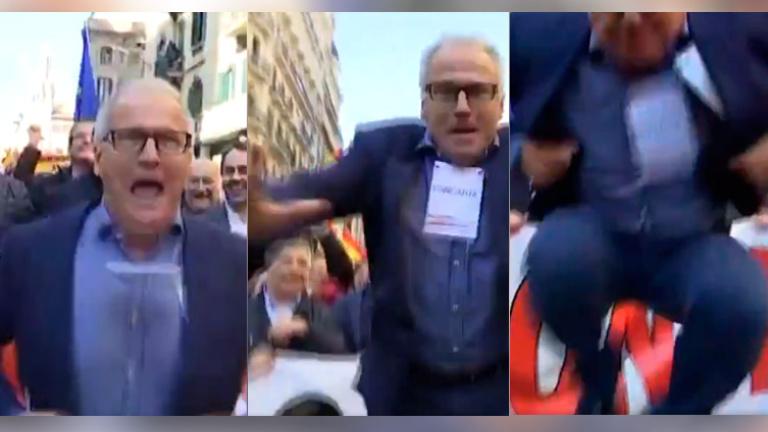 Ante la mirada y las risas de otros participantes en el acto, como el ultraderechista Santiago Abascal, mientras un speaker cantaba “en pie si eres español”, Bou se colocó frente a la pancarta a la altura de la Vía Laietana y comenzó a saltar y brincar dándolo absolutamente todo. De hecho en algún momento parecía que el concejal podría llegar a hacerse daño: