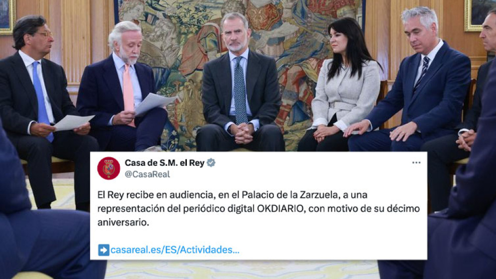 "Su majestad el rey ha recibido en audiencia a una representación del periódico digital Okdiario, con motivo de su décimo aniversario". Así anuncia la web de la Casa Real la recepción por parte de Felipe VI a miembros de la web de Eduardo Inda.