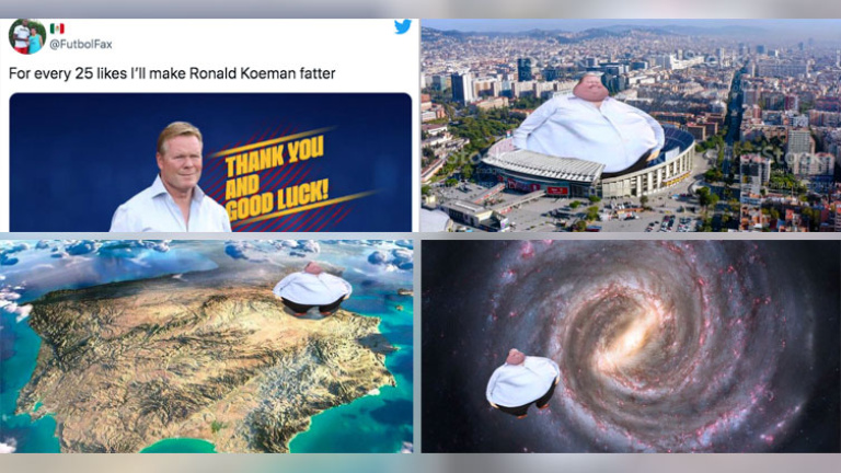 Todo empezó este miércoles, cuando la cuenta de Twitter @FutbolFax colgó una foto del entrenador del FC Barcelona y anunció "Por cada 25 'me gusta' haré a Ronald Koeman más gordo".