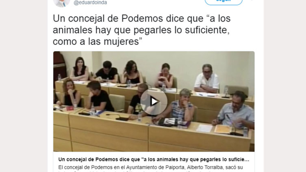 La información de Ok Diario asegura que Alberto Torralba "sacó su lado más machista" durante el pleno. Según la noticia, el concejal de Podemos ("podemita", según la información) "defiende el maltrato a los animales" y que hay que hacerlo "como a la mujer, sólo lo justo". Parece que Inda ha intentado aprovechar la ironía crítica de Torralba para arremeter una vez más contra la formación morada.