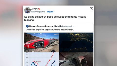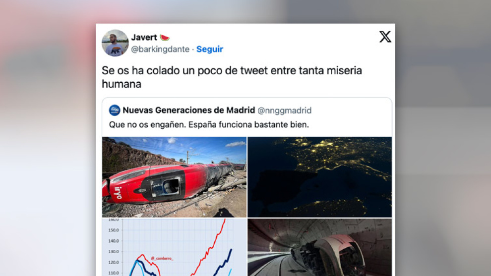 En un tuit comentan jocosos: "Que no os engañen. España funciona bastante bien". Y lo acompañan con cuatro imágenes. Entre ellas aparece una de accidente de tren Iryo y otra supuestamente del apagón, aunque es falsa (Balears aparece oscura pero no sufrió el apagón): un bulo que circuló en los días posteriores y que no han tenido reparos en recuperar.