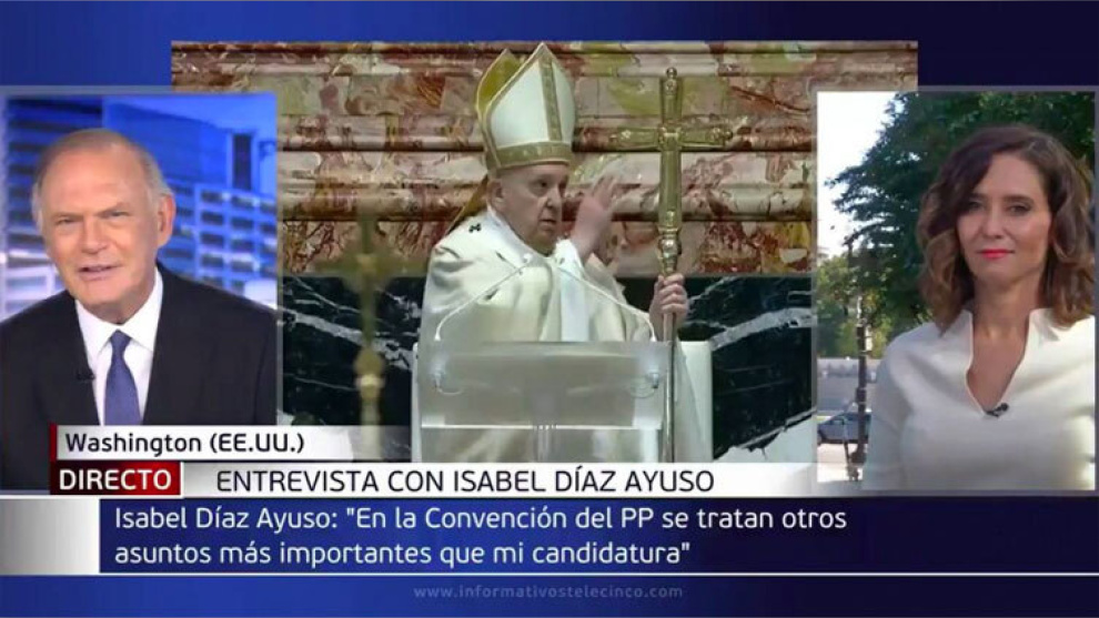 Durante la entrevista, Ayuso también anunció que a partir del próximo lunes pondrá fin a todas las restricciones de aforo en la región. Pero el momentazo de la entrevista llegó cuando Piqueras, con una media sonrisa en su cara, le preguntó a Ayuso por su crítica al Papa Francisco por pedir perdón a México por los daños causados por la Iglesia católica durante la conquista de América por parte de los españoles. "Vamos, que no le basta con emprenderla aquí contra Pedro Sánchez, que hasta con el Papa tiene usted una disputa, ¿Tiene algo que decir al respecto?".