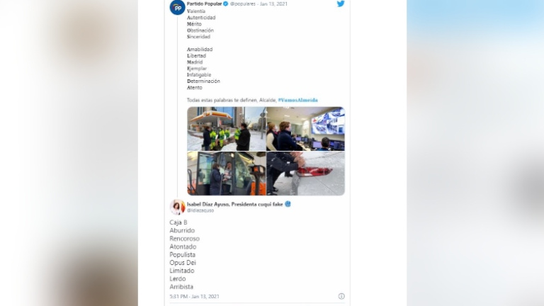 El Partido Popular ha alabado a través de su cuenta de Twitter la labor del alcalde de Madrid, José Lusis Martínez Almeida, ante la caótica llegada del temporal de nieve, Filomena. El partido ha llenado de adjetivos las letras de: "Vamos Almeida", comos si de una regla mnemotécnica se tratara.