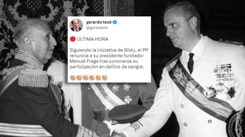 "Última hora. Siguiendo la iniciativa de Bildu, el PP renuncia a su presidente fundador Manuel Fraga tras conocerse su participación en delitos de sangre", publicaba en su cuenta de Twitter.