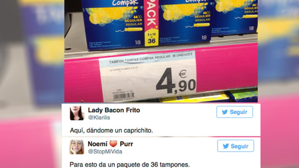 “Aquí, dándome un capricho”. Con estas palabras, una tuitera protestaba la semana pasada por el precio de este producto de primera necesidad para las mujeres. Su mensaje contenía la foto de un paquete de 36 tampones en un supermercado, al lado de su precio: 4,90 euros.
