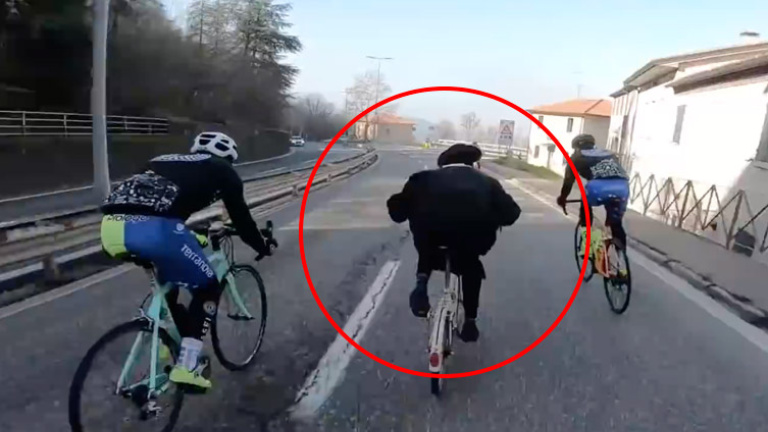 En el recorrido que hace, acompañado de otros ciclistas, se puede ver cómo circulan a velocidad temeraria tanto por carretera como por ciudad, realizan adelantamientos a coches con línea continua, invaden en varias ocasiones el sentido contrario, circulan por una rotonda en dirección contraria, etc.